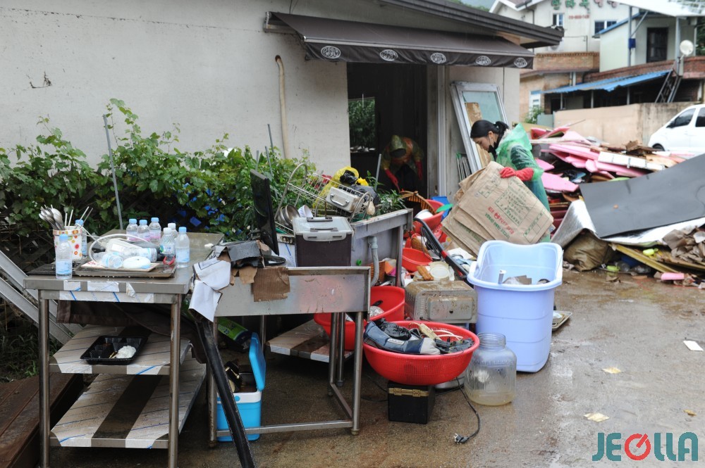 • 11일, 섬진강 범람으로 물벼락을 맞은 구례군 토지면 외곡리 수해 현장은 물 빠진 수중 마을의 모습이었다. 집 안에서 자원봉사자들의 손에 들려 나오는 가재도구나 가전제품 중 재사용이 가능한 제품은 거의 없어 보였다.
