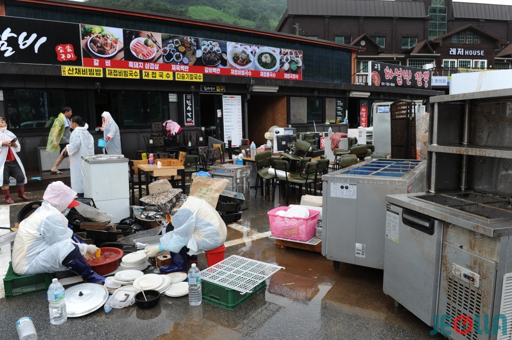 • 폭우가 쏟아지지는 중에도 복구 작업 중인 자원봉사자들